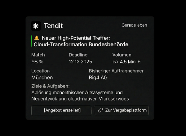 Der Tendit KI Agent überwacht 24/7 den Vergabemarkt für öffentliche IT-Projekte, analysiert RFPs und bereitet Angebote vor. Damit Sie mehr Umsatz gewinnen, ohne Zeit zu verlieren.