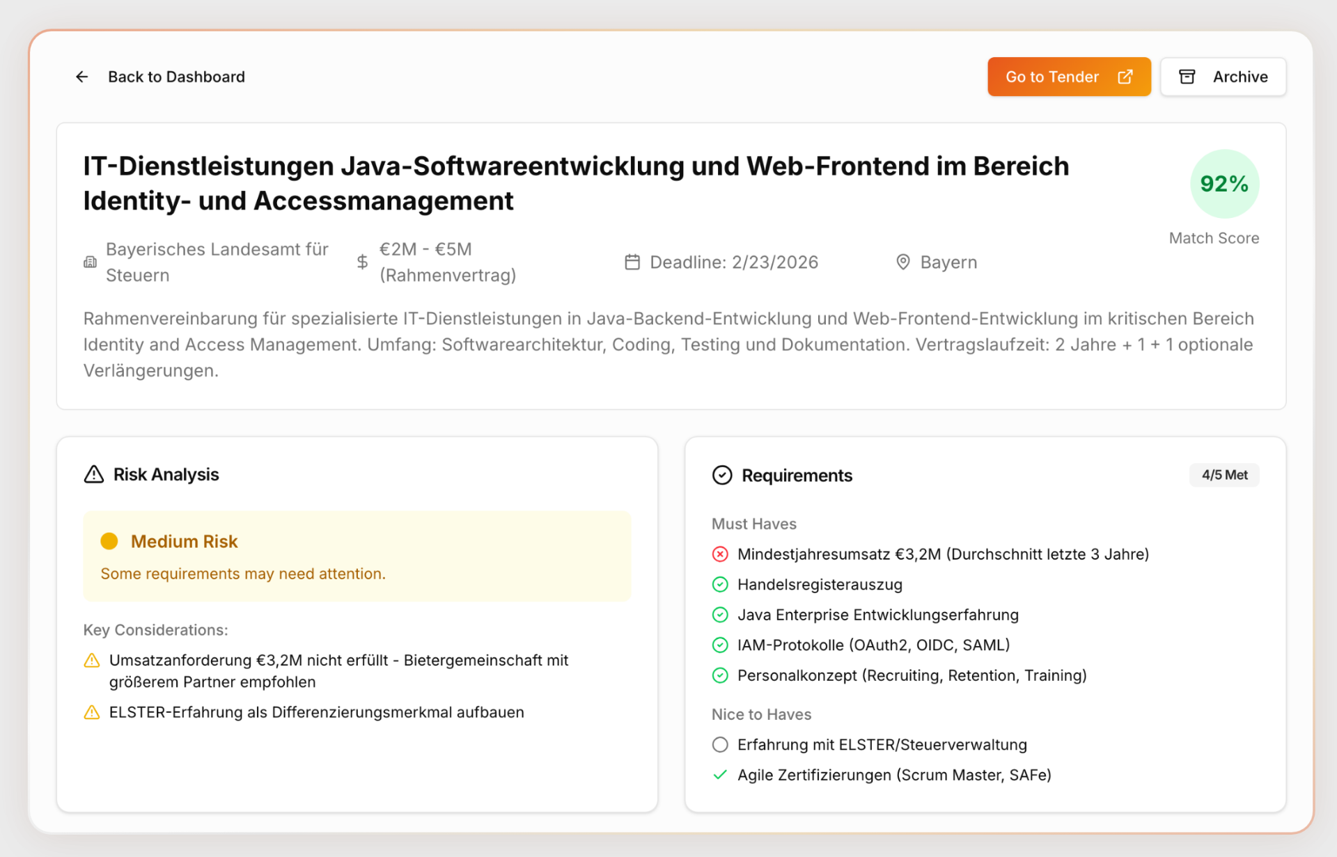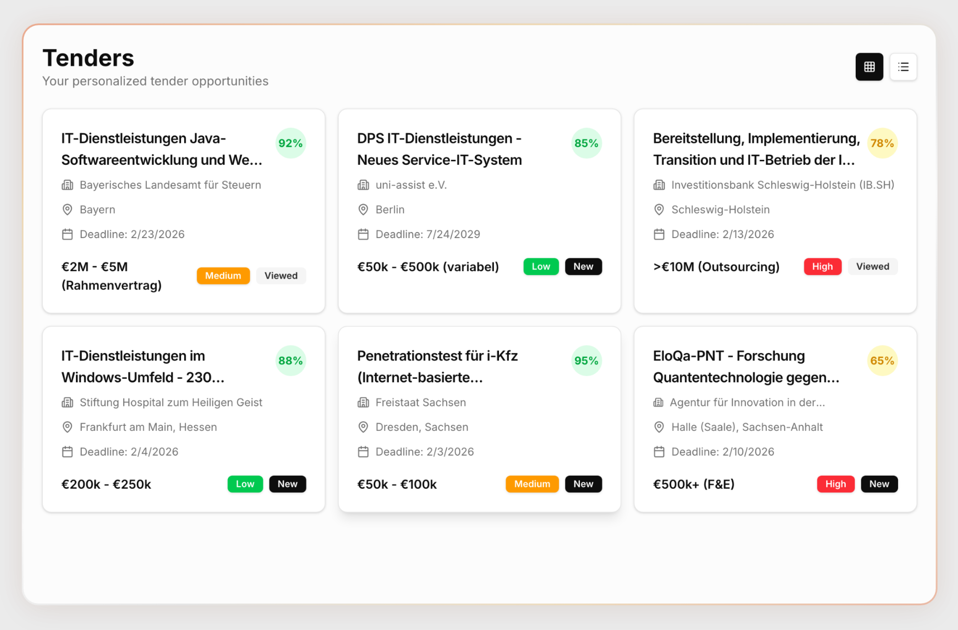 Unsere KI analysiert öffentliche Ausschreibungsdaten und zeigt Ihnen personalisiert, welche IT-Ausschreibungen der letzten 6 Monate zu Ihrem Unternehmensprofil gepasst hätten -- mit konkreten Zahlen, Auftraggebern und geschätztem Volumen.